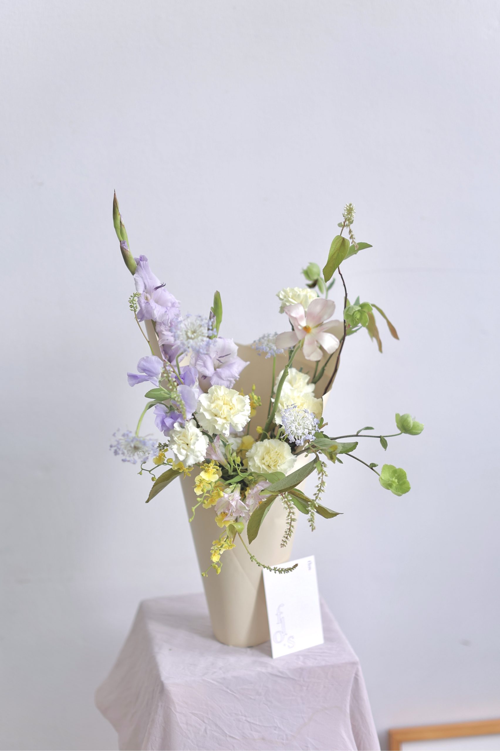The Gelato Bloom – Sorbet is a unique floral gift in KL that capture, softness, sweetness and sculptural elegance in one floral composition. We drew inspiration from the nostalgic silhouette of an ice cream cone, this arrangement is reimagined through expressive florals in pastel blush, lilac, and sweet cream hues-balancing whimsy with elevated composition. Our florists place each stem with intension to create movement, texture, and visual delight from every angle.